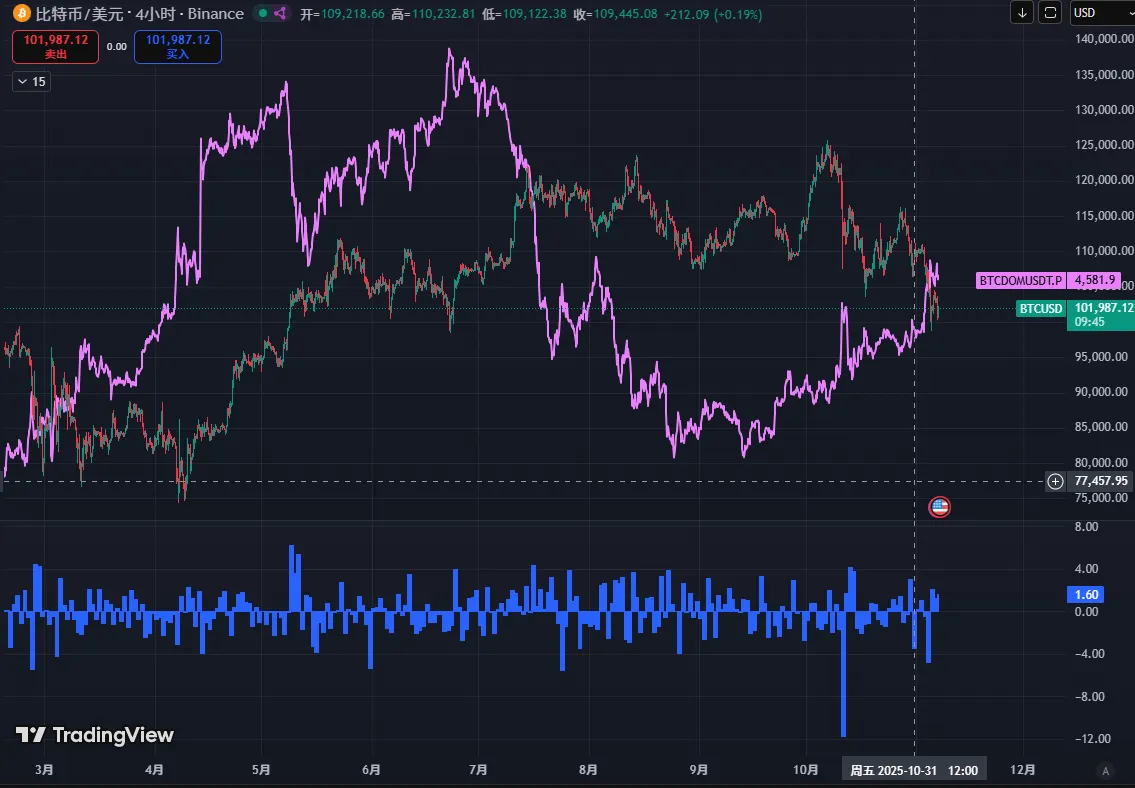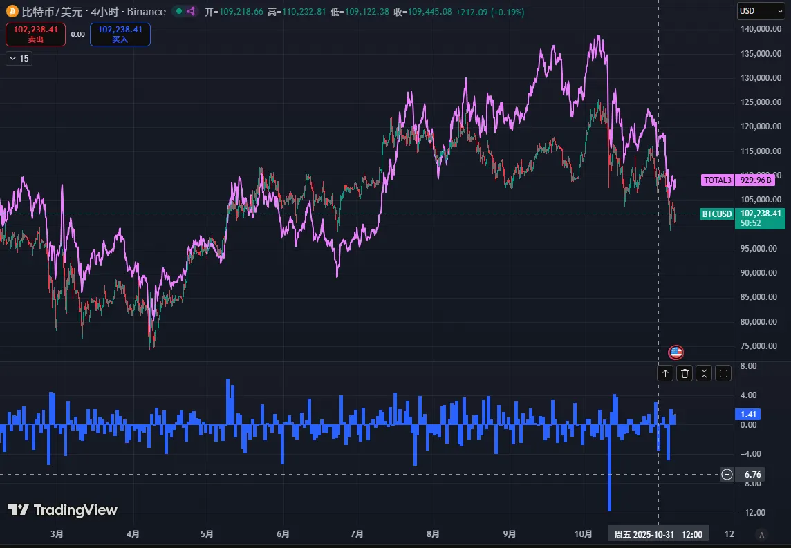 本周五 TOTAL3(除 BTC、ETH 外全代币市值)9299 亿美元,环比下降 6.28%,整体呈 “快速下跌 + 低位震荡” 走势。周三 BTC 从 104000 美元跌至 99000 美元期间,山寨币表现抗跌;周三后妖币(CUDIS、HMSTR 等)轮番拉升,币安系代币(GIGGLE、币安人生)表现亮眼,隐私代币震荡走高,盘中赚钱效应凸显,或为悲观情绪阶段性释放后的新起点。