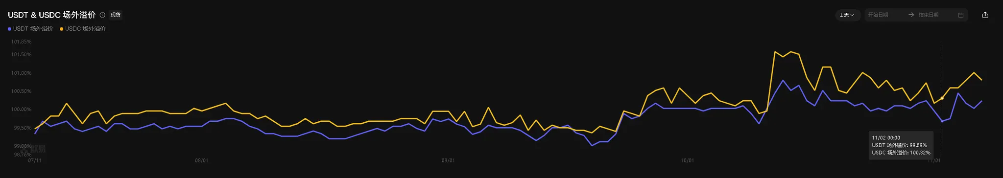 随着 11 月 2 日大盘回落,USDT、USDC 场外溢价率明显拐头反弹,显示下跌行情仍吸引部分场外资金抄底。但反弹力度较 10 月 11 日第一波快速下杀时偏弱,市场抄底情绪趋于谨慎。