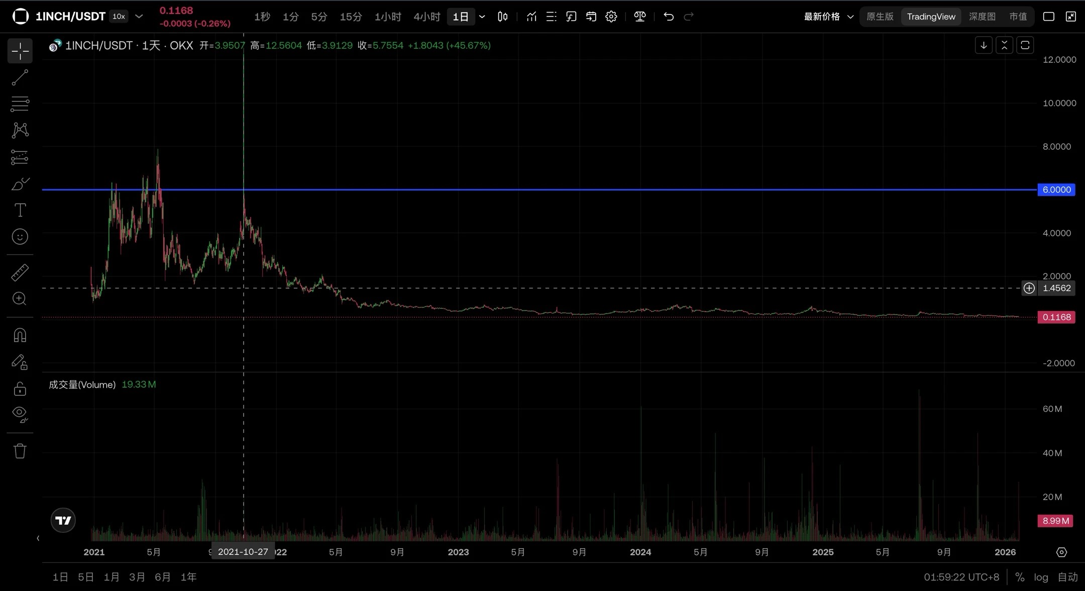 然而,即便最终被证明是一场误读,这次卖出对 1INCH 本就持续走弱的价格而言,依然构成了现实层面的二次冲击。自上一轮周期高点6 美元起,1INCH 已经历了长期的单边下行,如今徘徊在0.11 美元附近。