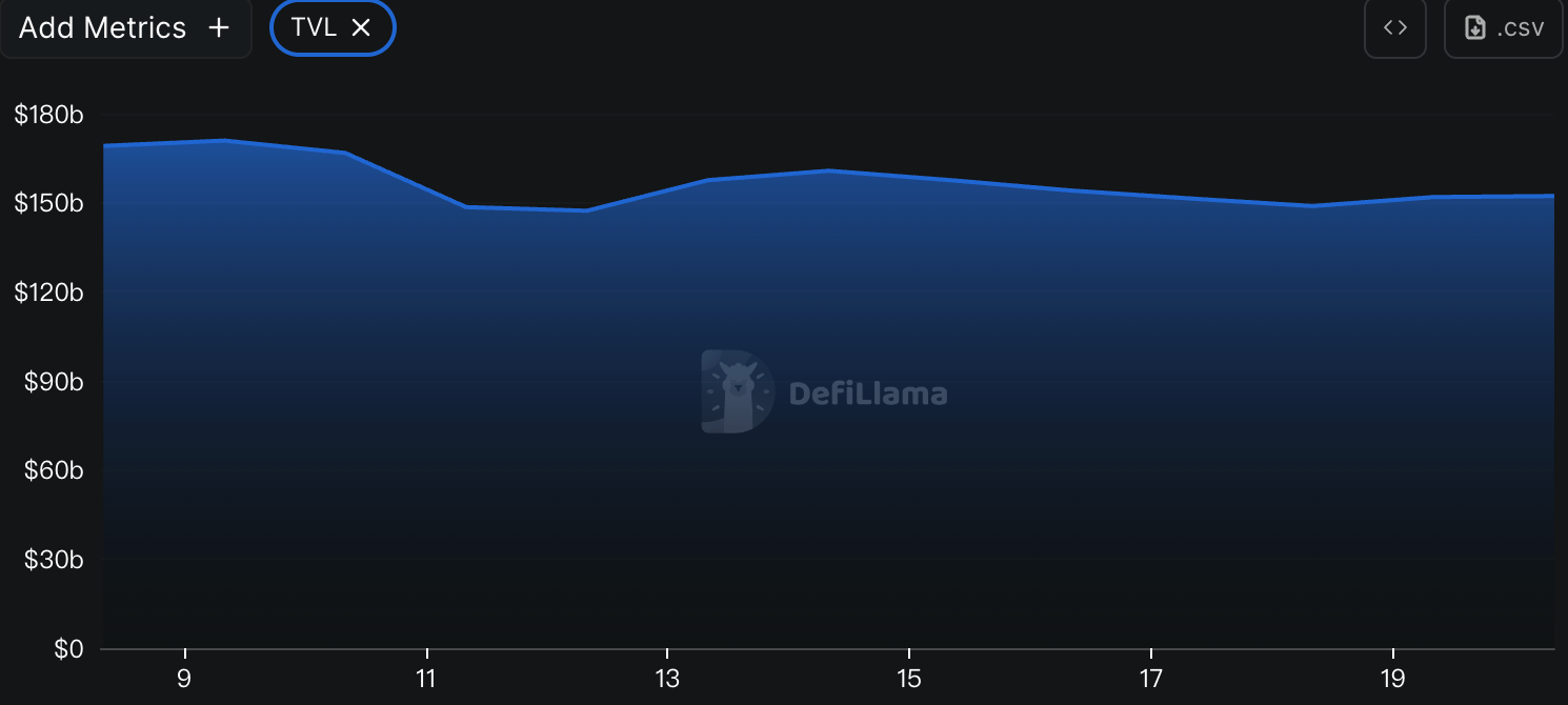 据DeFiLlama的数据,本周DeFi总TVL为1,344亿美元,较上周1,496亿美元,下降约10.16%。