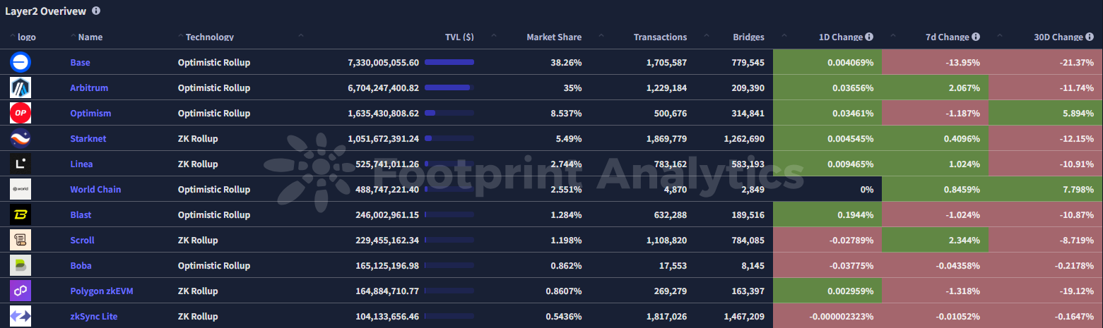 Base和 Arbitrum 分别以38.26% 和 35% 的市场份额占据前排,本周 Arbitrum在以太坊Layer2的TVL中位居第一。