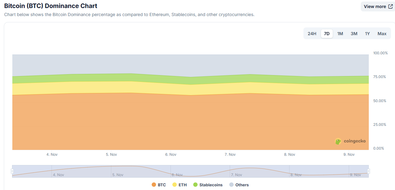 截止至发稿,比特币的市值为2.12万亿美元,占加密货币总市值的57.76%。与此同时,稳定币的市值为3,110亿美元,占加密货币总市值的8.48%。