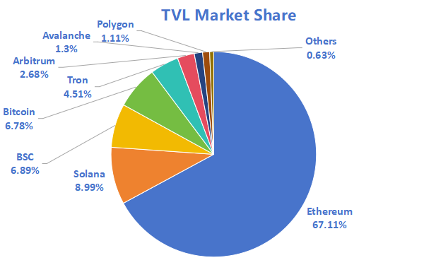 按公链进行划分,其中TVL最高的三条公链分别是Ethereum链,占比67.11%;Solana链,占比8.99%;BNB Chain,占比6.89%。