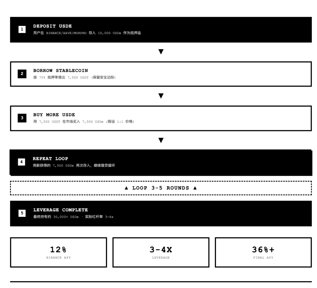 但当 25 年 Crypto 市场进入四年周期的尾部,稳定币成为年内唯一实现规模正增长的赛道,稳定币”高息揽储“成为 DeFi 协议、CEX 在这个红海市场最有效的增长工具时,它们普遍开始在产品机制和市场宣传上鼓励引导用户使用 USDe 进行体外循环借贷。