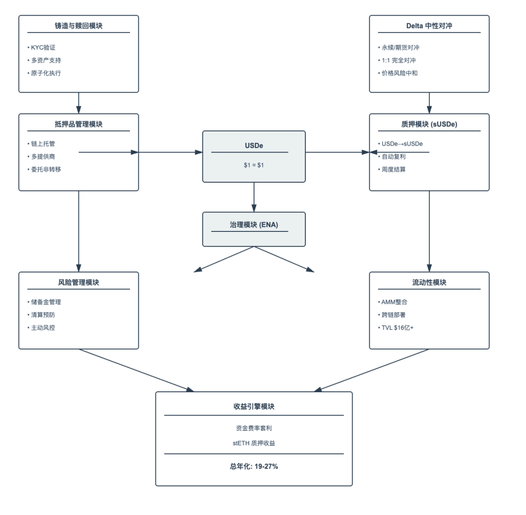 以受 Arthur Hayes 启发而创建 YBS 协议 Ethena 的 USDe 为例,它构建了一个由铸造与赎回模块、Crypto 原生中性策略模块、抵押品管理模块、质押模块( sUSDe )、风险管理模块流动性池模块、收益引擎模块以及治理模块共同组成的既不依赖法币储备也不依赖 Crypto 原生资产超额抵押的合成美元协议。