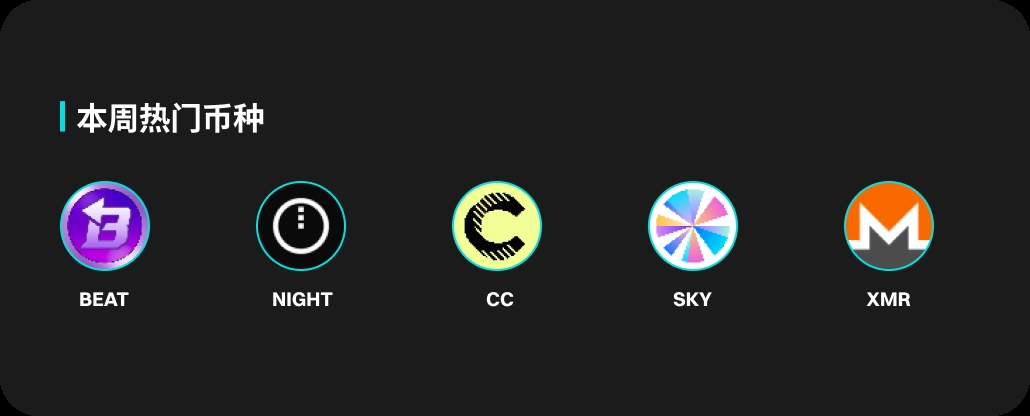 热门币种方面,BEAT、NIGHT、CC、SKY和XMR都有着不俗的表现,涨幅百分比位列前五。 BEAT本周价格上涨61.14%。NIGHT价格上涨55.61%。CC价格上涨24.03%。SKY和XMR本周分别上涨17.32%和15.13%。