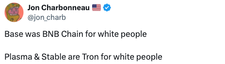 一段时间前,我刷到 Jon Charbonneau 的这条推文时忍不住笑了。当 Base 被称作“白人的 BNB Chain”,这个调侃背后到底在说什么?