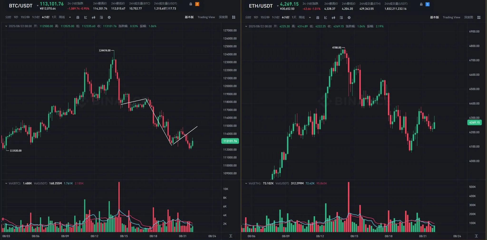 从 BTC 走势看,全周呈现多波段下行、低点持续刷新的格局:上周四(8.14)下跌后虽进入多头反弹,但反弹力度疲软,在 119000 美元处遇阻回落;17 日晚间开启的下跌调整级别不足,导致 18 日、19 日的四小时级反弹未能延续。20 日晚 8 点,技术面本有望启动四小时至日线级反弹,但受美股拖累,9 点左右突发下杀,后续持续低位震荡。
