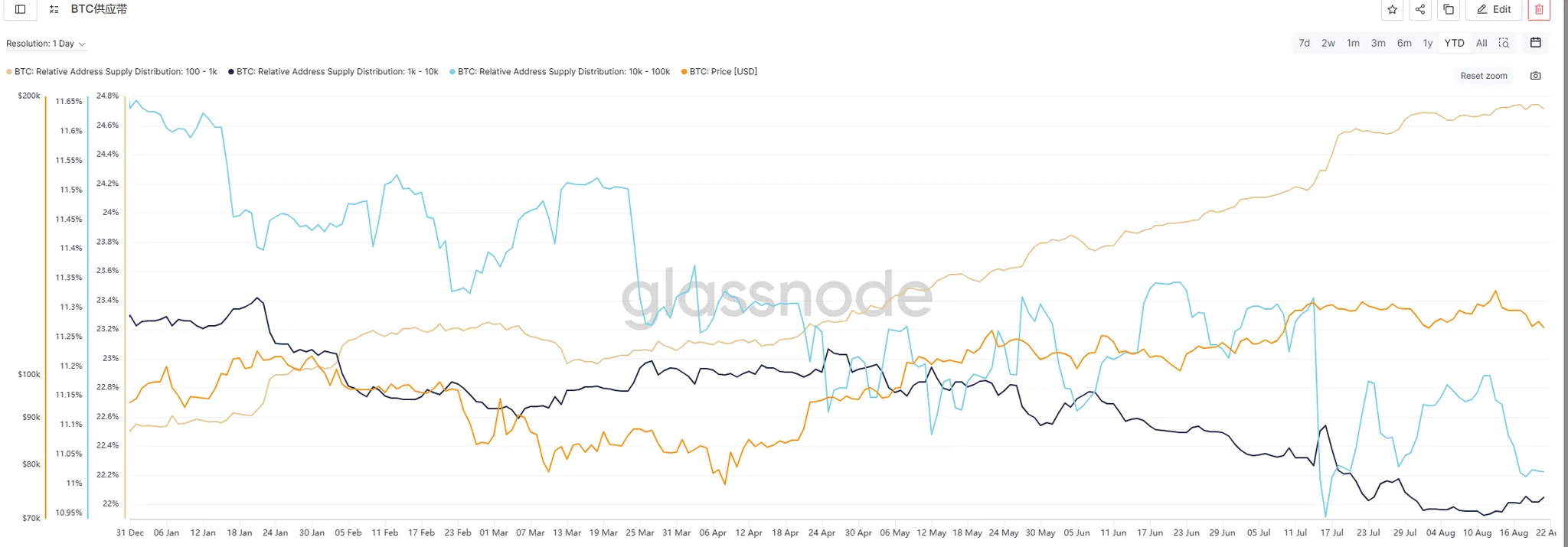 10K-100K BTC 的大户地址:持币占比大幅下探,抛售动作明显 —— 这是本周 BTC 持续走弱的核心原因。