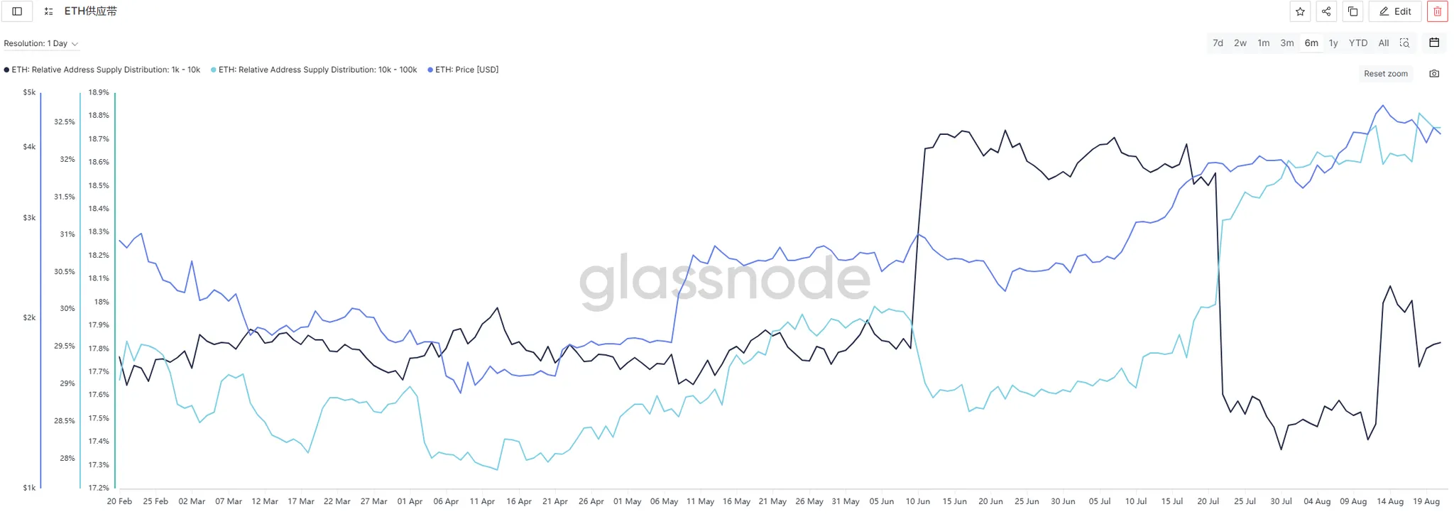 ETH 10K-100K 大户地址持币占比能否回升,避免背离扩大;