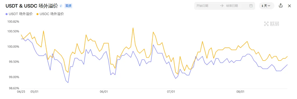 本周 USDT、USDC 场外溢价率整体处于震荡区间,未出现牛市 FOMO 情绪下的轻微溢价,但8 月 18 日起溢价率明显向上拐头,说明在市场回调过程中,已有部分场外资金悄然进场抄底,为市场提供了一定承接力。