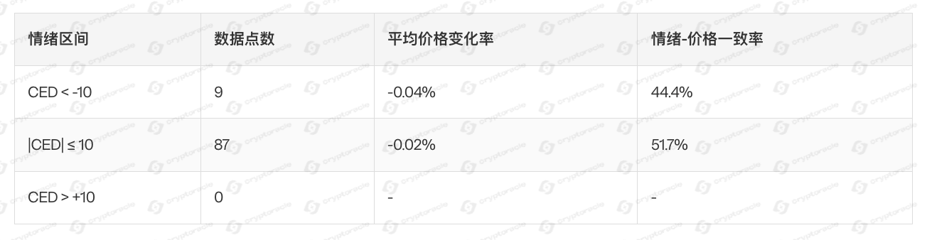 - 极端悲观区间(CED < -10)价格表现反而优于中性区间,显示情绪过度悲观后易引发技术性反弹