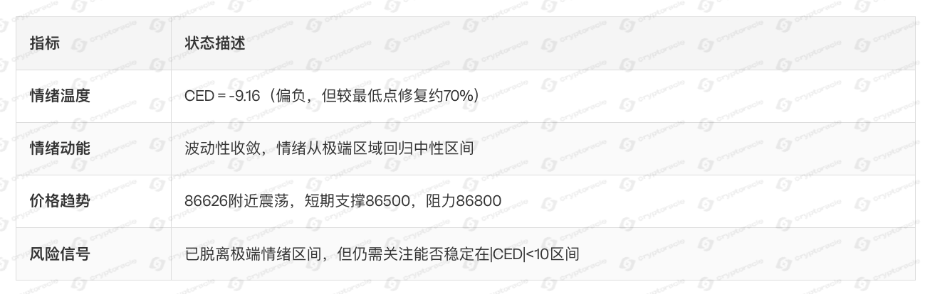 - 未出现极端乐观情绪(CED > +10),反映市场整体偏谨慎