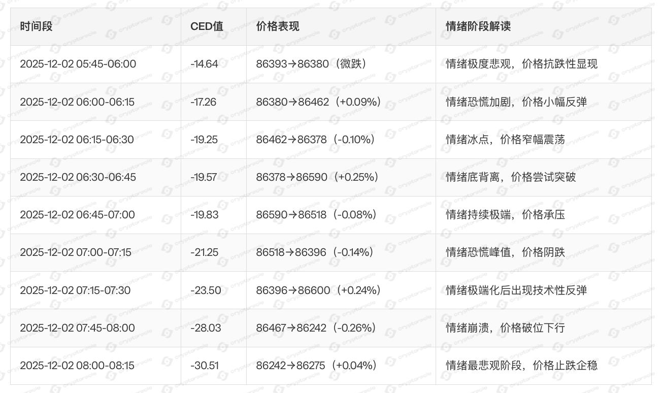 - 夜间(20:00-次日06:00):情绪加速恶化(CED 0.56→-30.51),价格大幅波动
