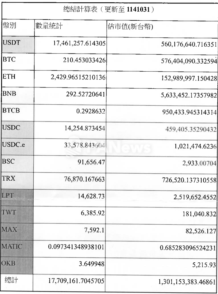 PANews 12月18日消息,据中国台湾地区科技立委葛如鈞 Ko Ju-Chun 展示的公文显示,截至2025年10月31日,台湾检察机关共扣押210.45枚比特币(BTC),按当时市值约新台币5.76亿元。该清单中还包含ETH、BNB、TRX等多种虚拟资产。