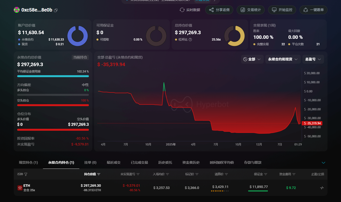 不过,具体到实际的交易当中,在10月11日市场暴跌之前他的总体仓位还保持盈利1500万美元的水平。而在10月11日的暴跌之后,因为XPL和ETH等多个订单爆仓,他的总体盈利转为了亏损1100万以上。随后, 伴随着更多的操作,他离回本越来越远。