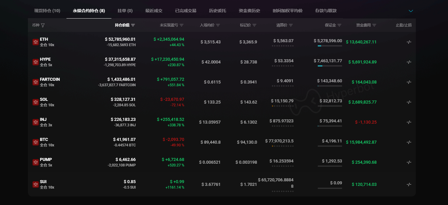 0x5b5d51203a0f9079f8aeb098a6523a13f298c060这个地址是当前Hyperliquid上盈利排名第一的地址。如果说前两位是“赌徒”和“猎手”,这位就是做市商级别的超级巨鲸。截至目前,该地址已经向Hyperliquid累计存入了11.1亿美元,让然后提走11.6亿美元。目前的浮盈约为1.43亿美元。