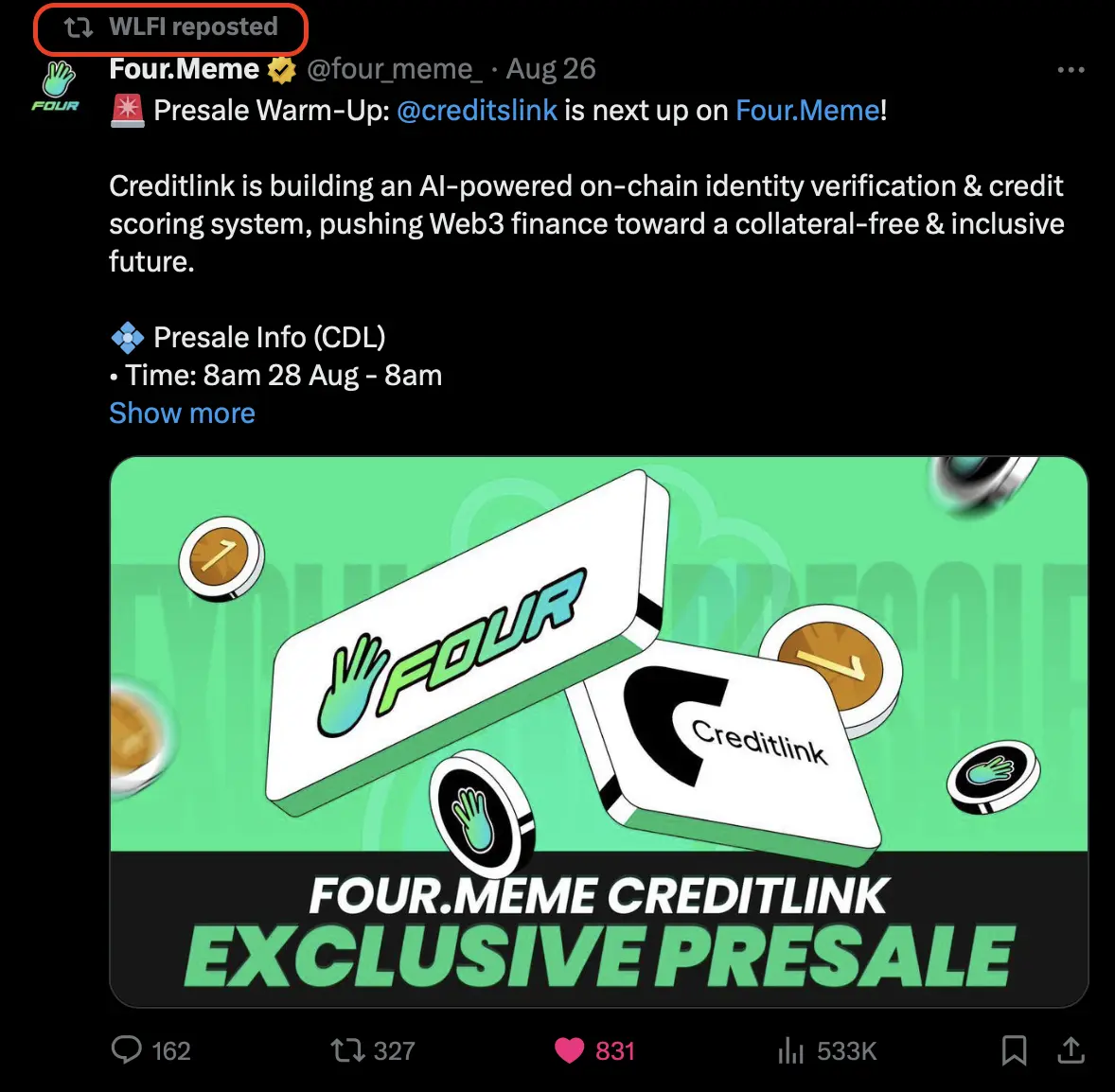 本次 Presale 募集资金主要为 USD1,Fourmeme发推感谢了WLFI对本次预售的支持,WLFI官方转发了这条推文,确认了此次合作。随后BNBChain官方转发了$CDL 资金破亿的推文,同样表示了支持。
