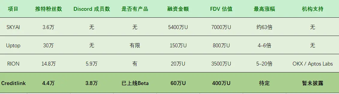 为了更直观,把 Creditlink 和之前的几个热门 TGE 项目对比一下: