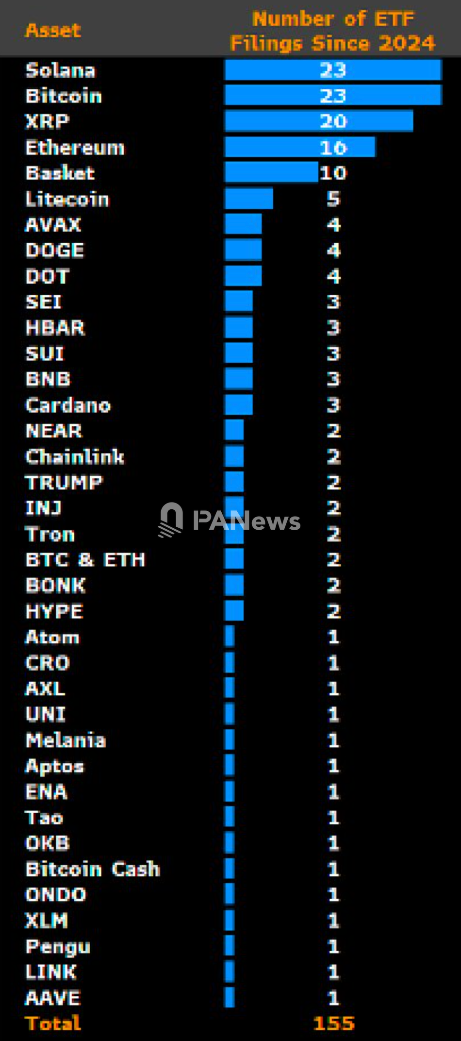 PANews 10月22日消息,彭博ETF分析师Eric Balchunas发推表示,目前已有 155 份加密 ETP 申请,追踪 35 种不同的数字资产。未来12个月或增至200项。