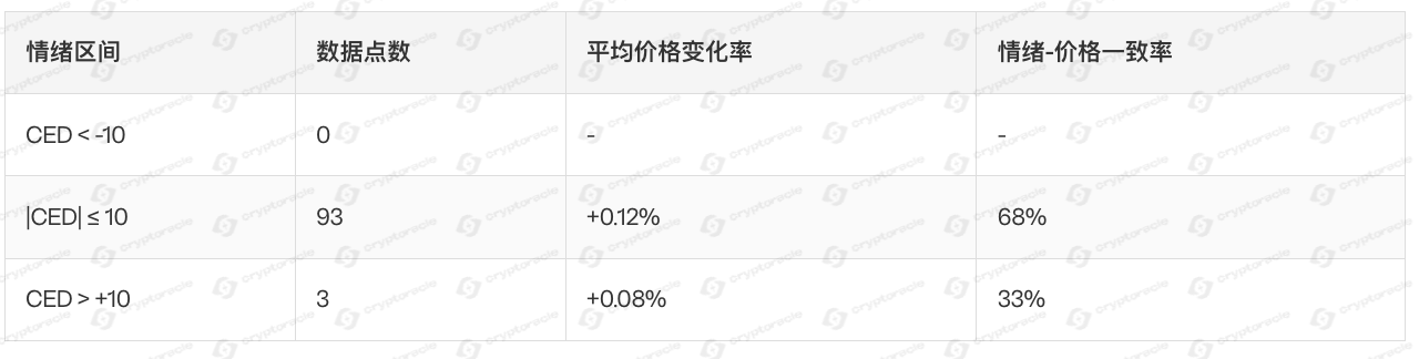 趋势结论:情绪温和区间(|CED|≤10)价格表现相对稳健且一致率较高;而极端乐观区间(CED>10)虽然价格仍上涨,但情绪-价格一致率显着下降,暗示情绪过度乐观时价格跟进动能可能减弱。