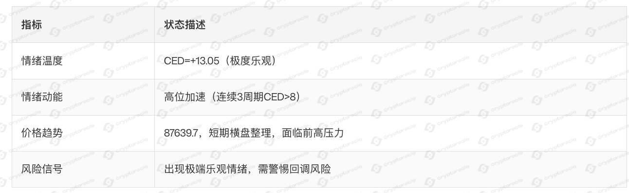 过去24小时内,BTC市场情绪呈现先抑后扬的总体走势。早期情绪偏负(CED多位于负区间),午后至夜间情绪逐步修复,尾盘显着转正并持续走强。