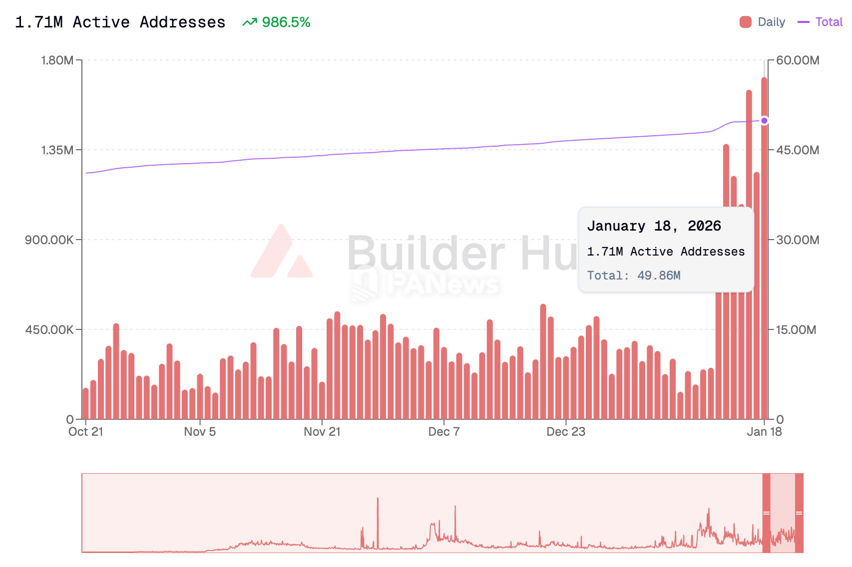 PANews 1月19日消息,数据显示,2026年1月18日(昨日)Avalanche链上活跃地址达171万,较前期均值暴增986.5%,再创新高。总活跃地址累计已接近4986万。此前Avalanche C-Chain日活维持在30万至60万区间,自1月中旬以来链上交互激增。官方称“链正在觉醒”。