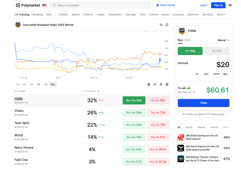 Polymarket 中预测 CS2 游戏布达佩斯 Major 2025 冠军页面