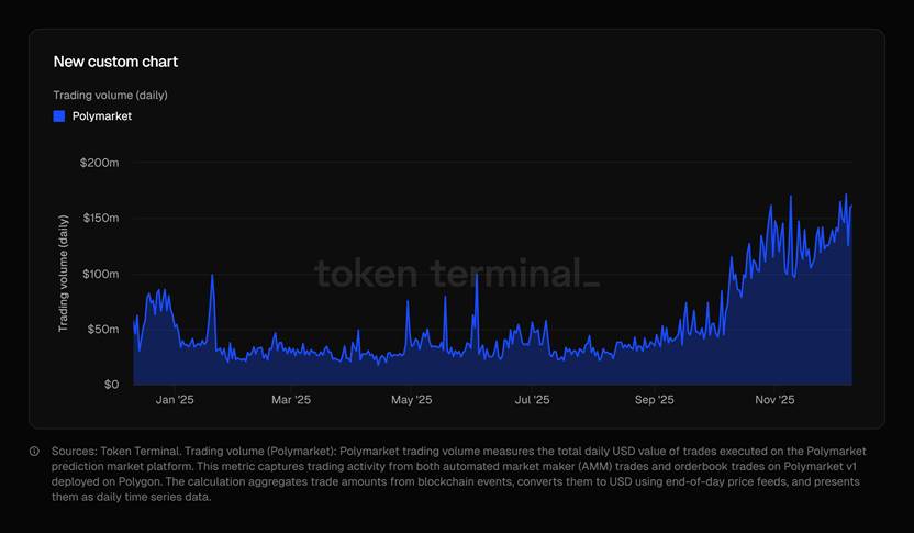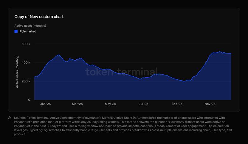 根据Token Terminal 数据库,截至 2025 年 12 月初,Polymarket活跃用户数已超过 50 万,交易量峰值超过 1.7 亿美元,可见预测市场的受欢迎程度是如此之高。