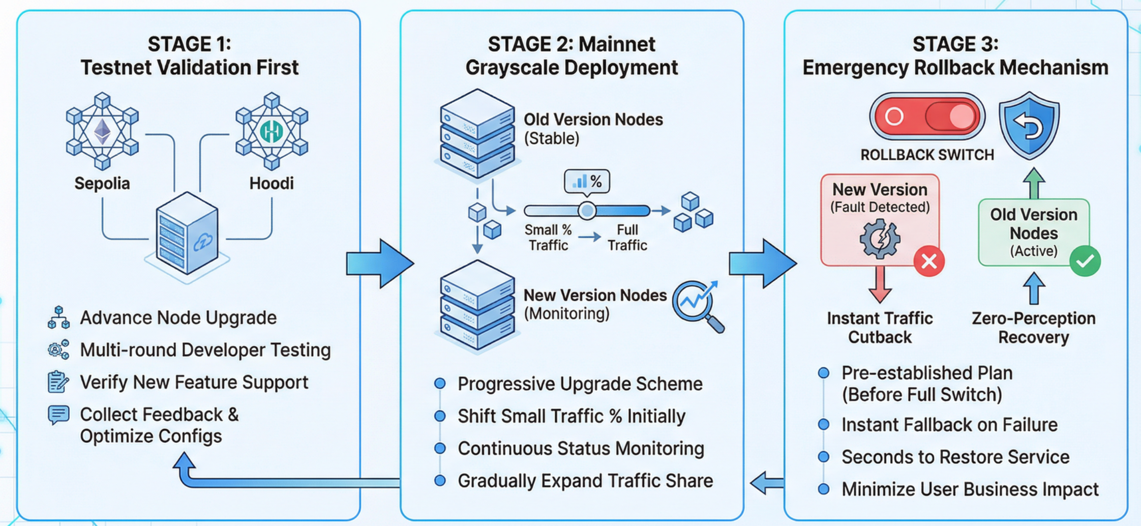 • 分阶段部署策略:严格遵循“先测试、后主网”的原则,提前针对Fusaka升级带来的“超级节点”性能挑战进行硬件扩容与配置调优。升级过程在测试网充分验证后,于主网采用渐进式灰度部署,并配备秒级回滚机制,最大限度降低风险,保障服务连续性。