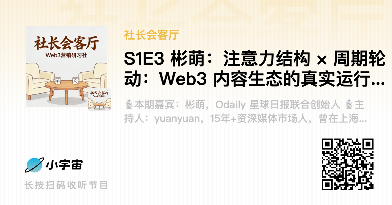 本期《社长会客厅》,我邀请到一位真正的行业老兵 — —Odaily 星球日报联合创始人 彬萌。她参与并见证了过去 7–8 年里,Web3 在亚洲乃至全球的每一次重要周期,也经历了中文加密媒体从“百花齐放”到“剩者为王”的全过程。
