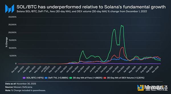 深入分析SOL的优异表现,实际上它可能表现不佳。在SOL跑赢BTC 87%的同一时期,Solana的基本面呈抛物线式增长。DeFi总锁定价值增长了2988%,手续费增长了1983%,DEX交易量增长了3301%。无论从哪个角度来看,自2022年底以来,Solana的生态系统都增长了20到30倍。然而,作为旨在捕捉这一增长的资产,SOL的表现却仅比BTC高出87%。