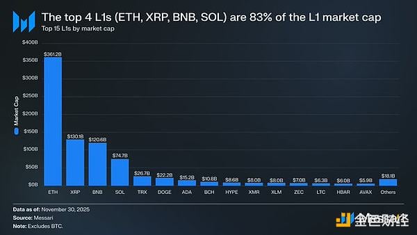 首先,了解一下L1目前的估值水平很有帮助。排名前四的L1,以太坊(3611.5亿美元)XRP(1301.1亿美元)BNB(1206.4亿美元)SOL(746.8亿美元)的总市值达到6865.8亿美元,占L1板块83%的份额。排名前四之后,估值迅速下降(TRX的市值为266.7亿美元),但有趣的是,长尾部分仍然相当可观。排名前15之外的L1总市值为180.6亿美元,占L1总市值的2%。