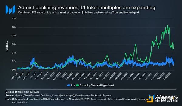 尽管存在这些相互竞争的估值框架,但市场越来越倾向于从营收驱动的角度而非货币溢价的角度来评估L1的价值。过去几年,市值超过10亿美元的所有L1的整体市销率(P/S)保持相对稳定,通常在150倍至200倍之间。然而,这个总体数字具有误导性,因为它包含了TRON和Hrperliquid。在过去的 30 天里,TRX 和 HYPE 创造了该组70%的收入,但市值仅占4% 。