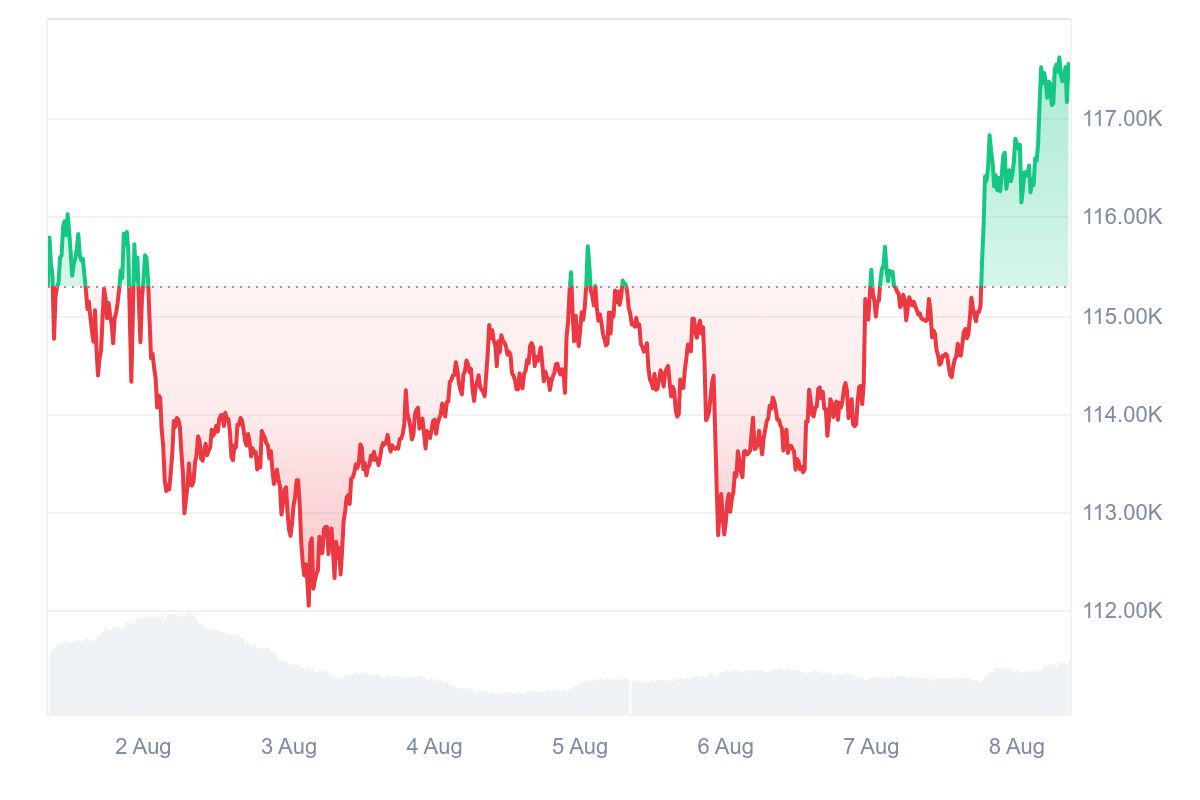 该消息助推比特币价格短线上涨约2%,一度突破117,500美元。