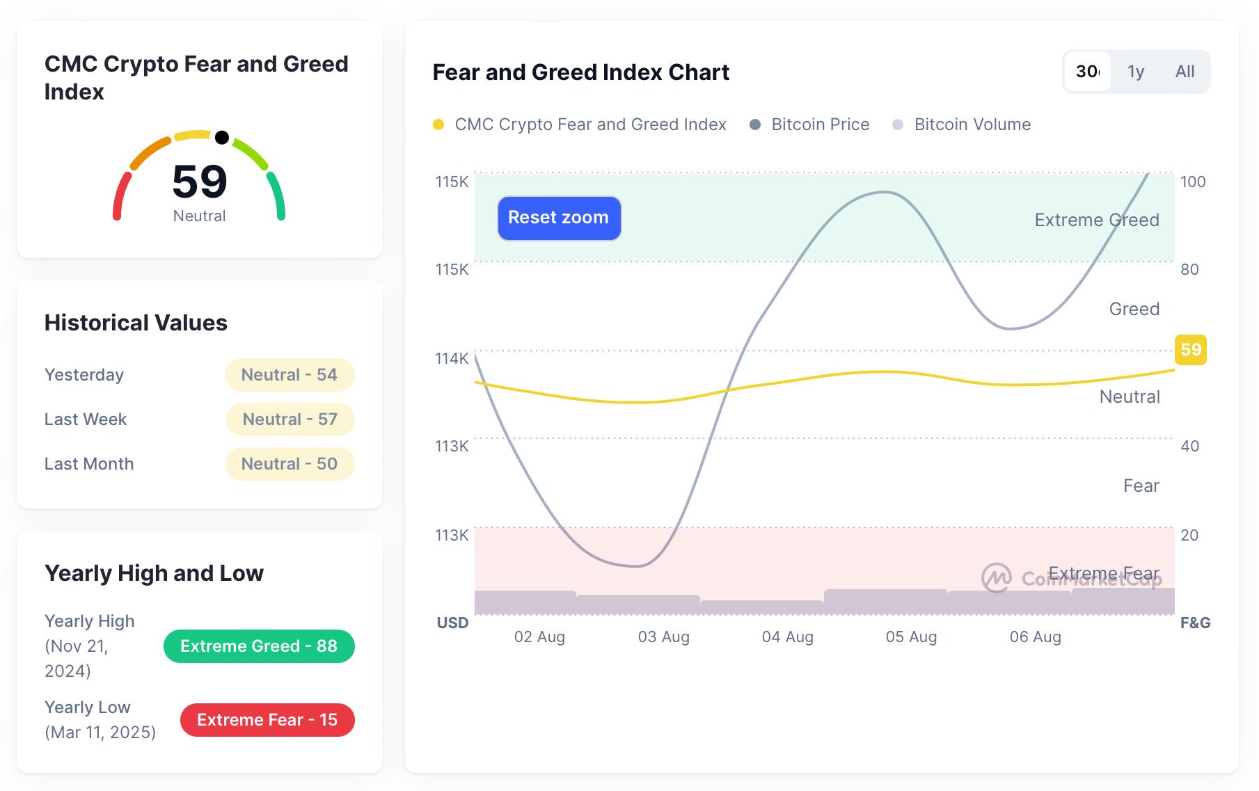 截至8月8日,恐惧与贪婪指数(Fear & Greed Index)暂报59,位于“中性(Neutral)”区间的上沿,已接近轻度贪婪的临界值,显示出市场情绪正从谨慎观望向相对乐观微调。