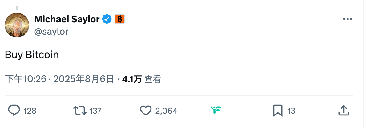 8月6日消息,Strategy 创始人 Michael Saylor 回复社区提问“您收到过最重要的投资建议是什么”时表示,Buy Bitcoin(买入比特币)。