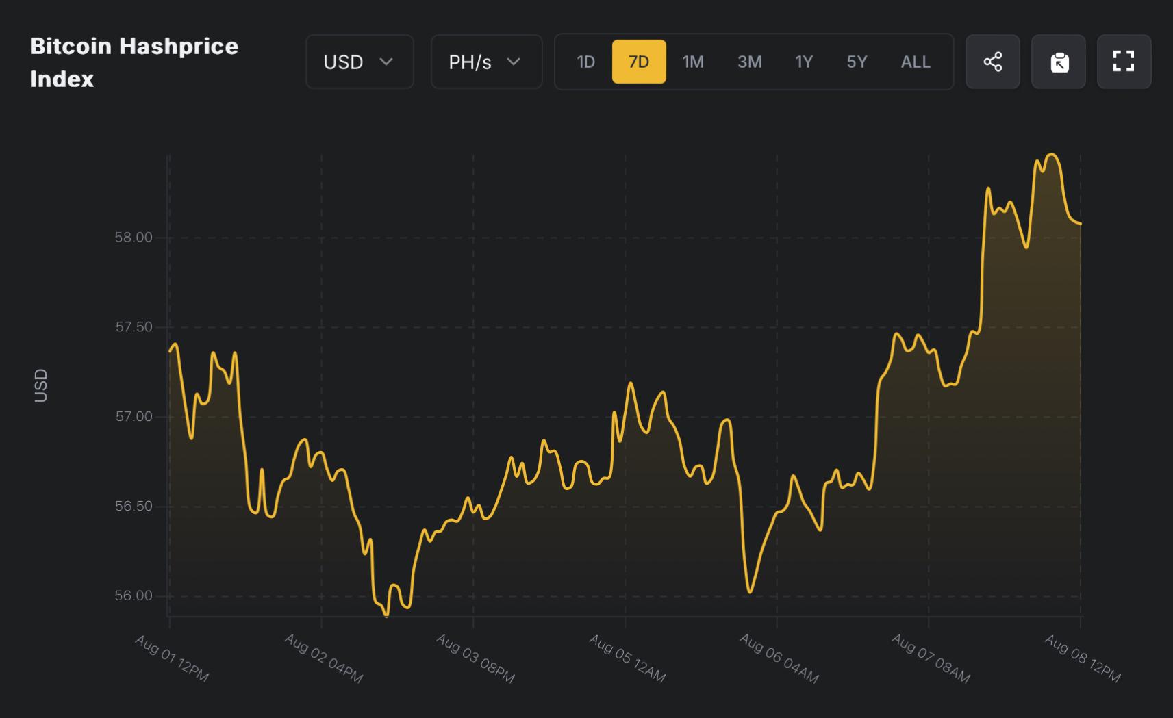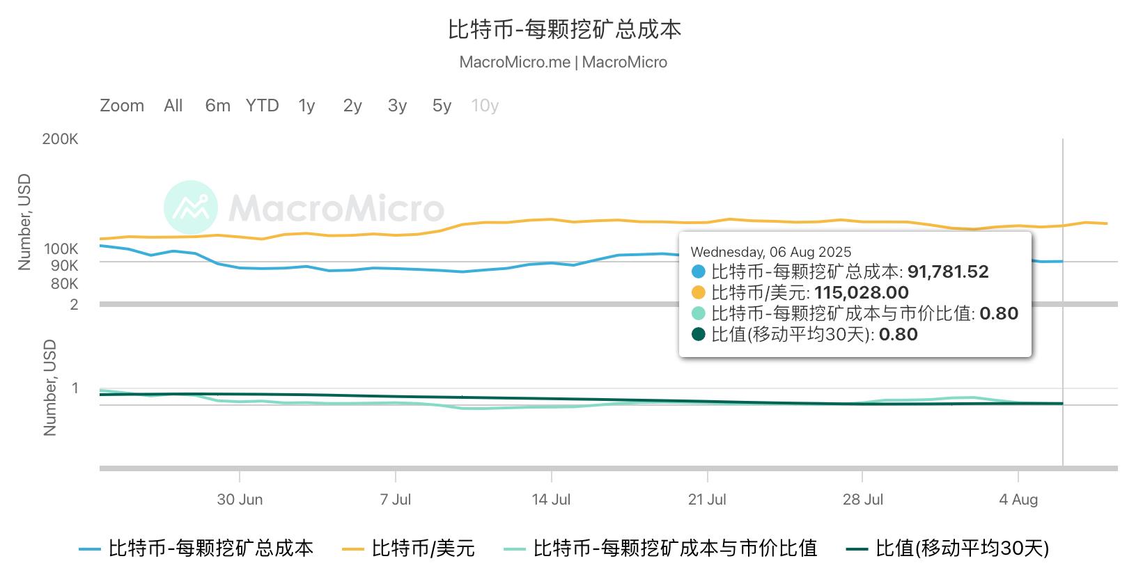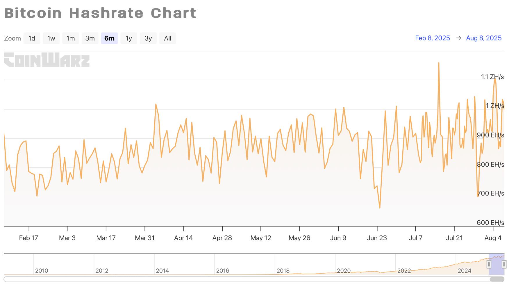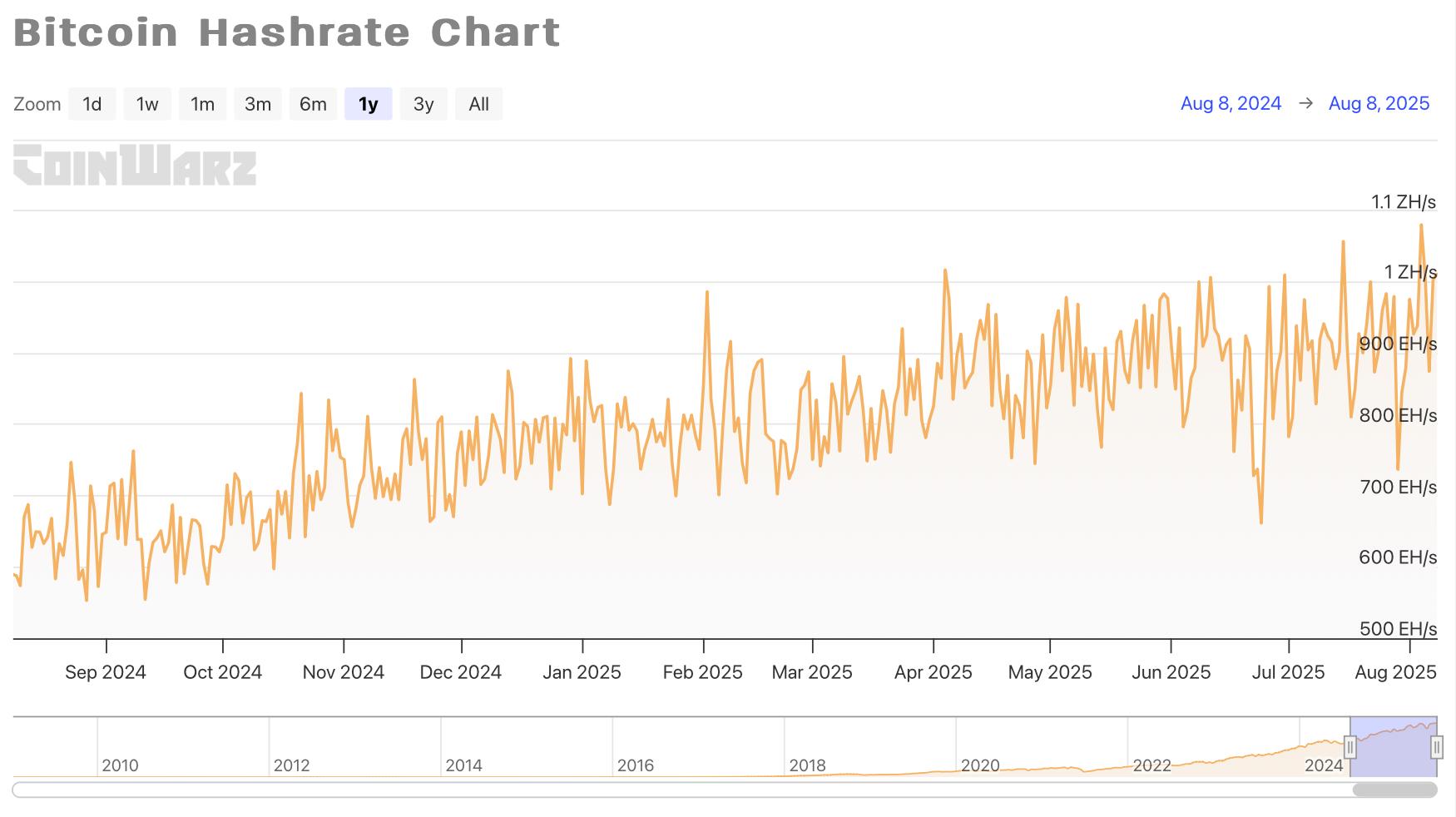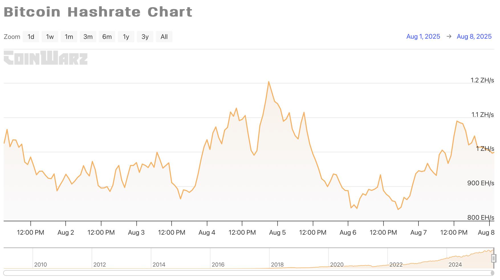 本周内,比特币网络哈希率经历了“攀升-回落-再攀升”的波动态势。8月2日至3日,哈希率整体稳定在900 EH/s至1 ZH/s区间,显示出网络算力处于较强支撑水平。8月4日,网络算力出现显著上升,达到本周最高点1.2048 ZH/s,反映出矿工积极增加算力部署。随后,8月5日哈希率快速回撤至900 EH/s附近。8月6日至8日,哈希率自本周低点832.81 EH/s逐步回升,8月7日午间升至1.0901 ZH/s,显示算力恢复动力强劲。8月8日哈希率小幅回落至996.67 EH/s,波动收敛,网络算力整体保持在高位运行。