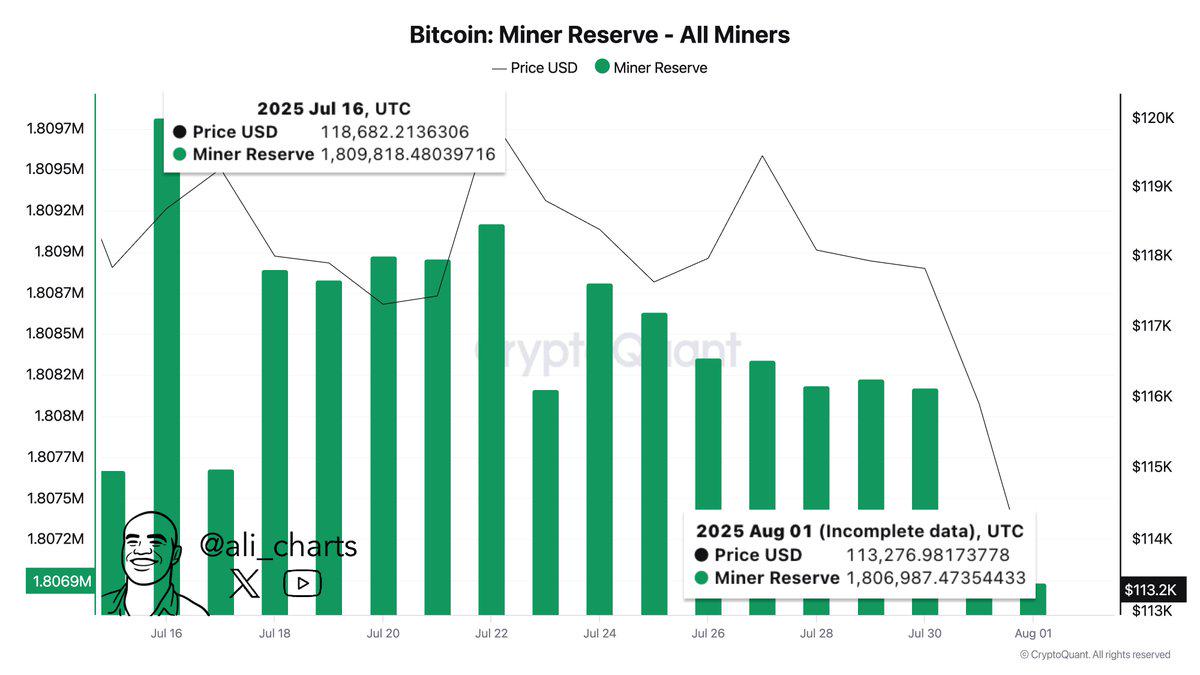 8月3日消息,据@ali_charts消息,比特币矿工近共两周减持超3000枚比特币。截至8月1日,比特币矿工持币量由7月16日的180.98万枚减持至180.698万枚。