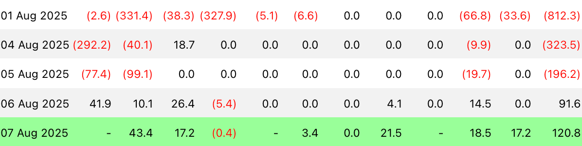 资金数据显示,比特币现货ETF在本周前两日遭遇大规模赎回,形成阶段性下行压力,但在8月6日与8月7日出现连续两日资金回流,显示抛压有所缓解。具体日度数据如下: