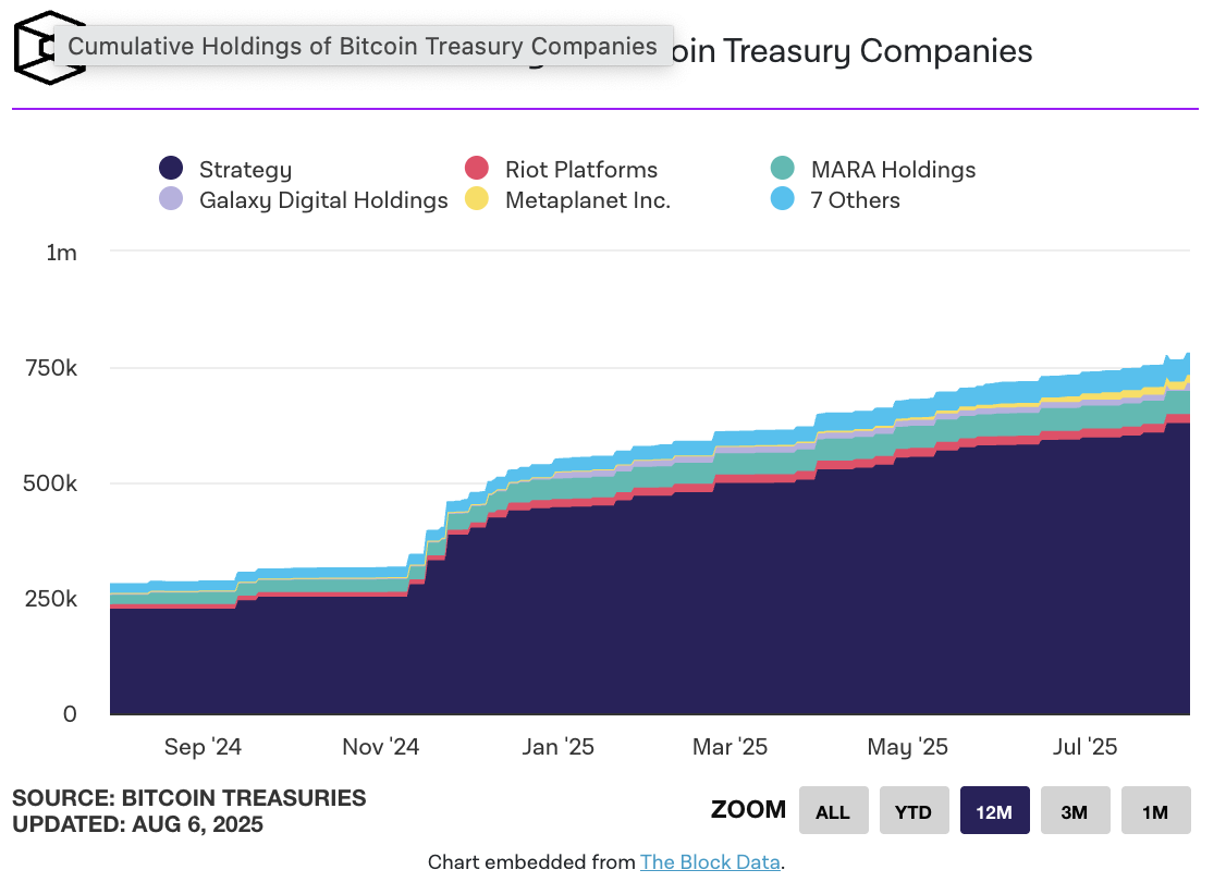 本周确认,MicroStrategy 在7月下旬至8月初期间共购入21,021枚BTC,总成本约24.6亿美元,使其总持仓达628,791枚BTC,位居全球企业榜首。