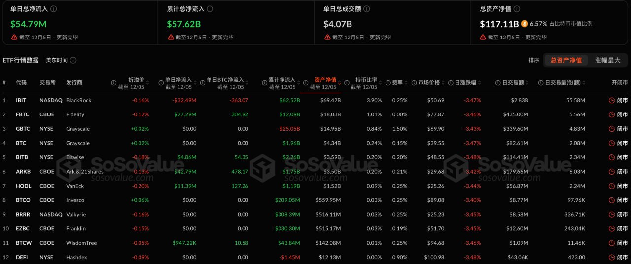 PANews 12月6日消息,根据 SoSoValue 数据,昨日(美东时间 12 月 5 日)比特币现货 ETF 总净流入 5478.96 万美元。