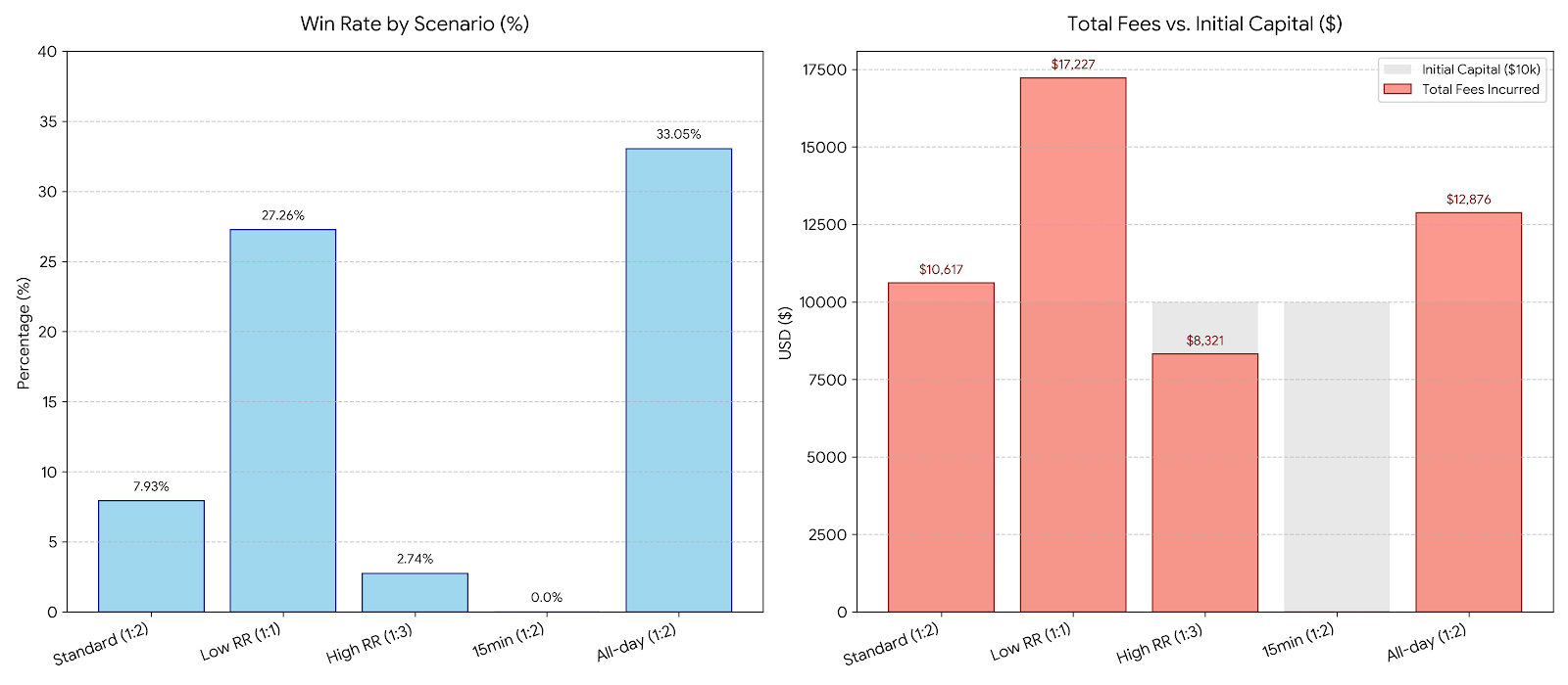 在 5 分钟级别的高频博弈中,降低 RR 并没有救活策略,反而因为交易频率的增加,让账户陷入了手续费黑洞。还没等策略盈利,交易所已经先实现了 170% 的收益。