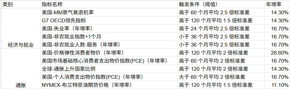 从景气衰退机率和就业市场来看,虽然近期有转弱迹象,但仍未达到警示门槛。例如,美国非农扩散指标虽有减速、失业率有所上升,但目前均未达到极端门槛,显示就业市场处于“放缓”阶段,并非“全面恶化”导致的深度衰退风险。