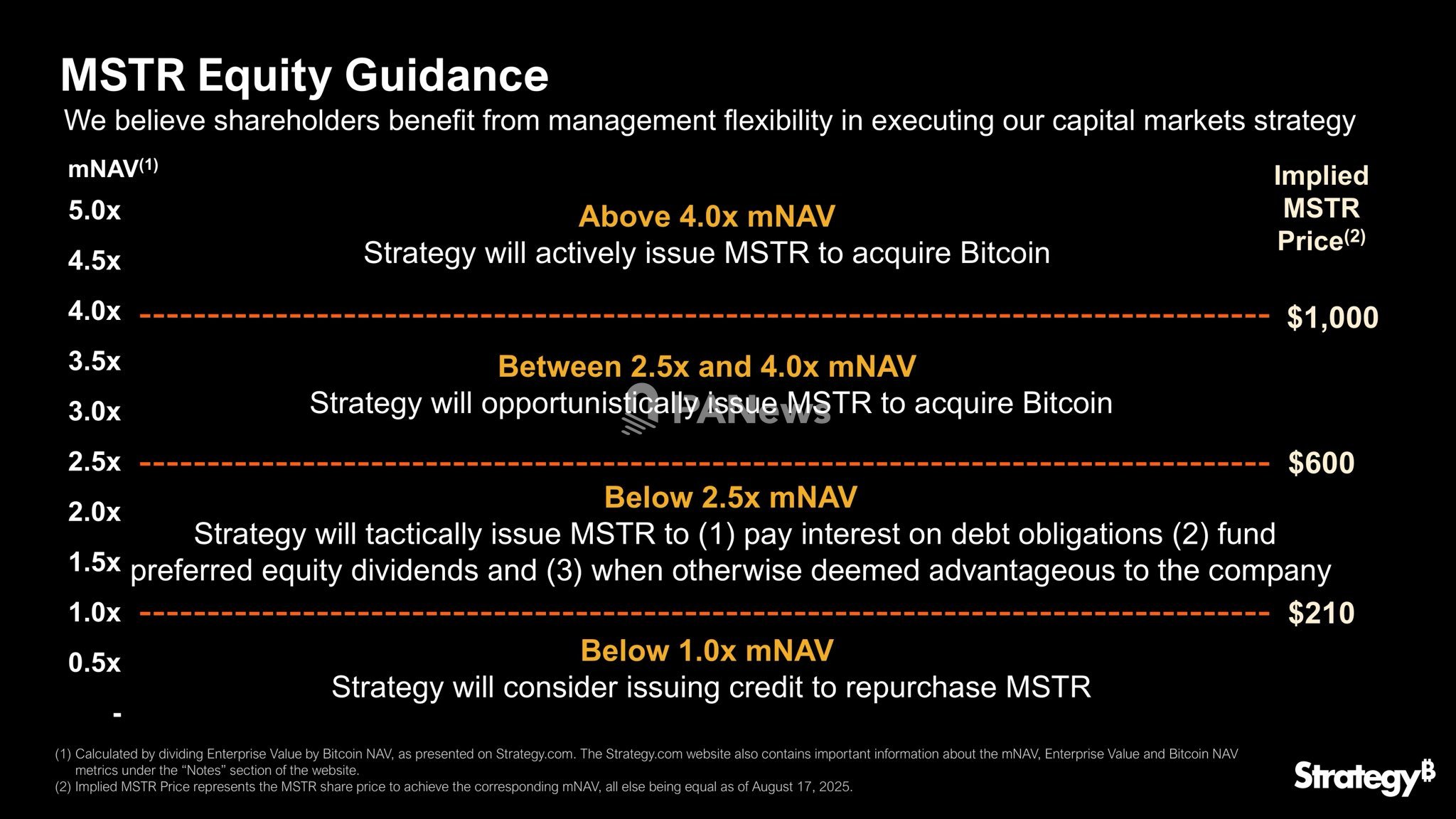 PANews 8月20日消息,Michael Saylor近日在X平台发文称,公司更新了MSTR股票ATM指引,以便在资本市场操作上更具灵活性。新政策允许当MSTR股价低于净资产值的2.5倍时仍可发行新股,用于偿还债务利息及派息等资金需求。此举引发股东反弹,有投资者质疑公司在财报电话会上承诺“不低于2.5倍NAV发行”,却很快改变政策,认为此举释放负面信号。