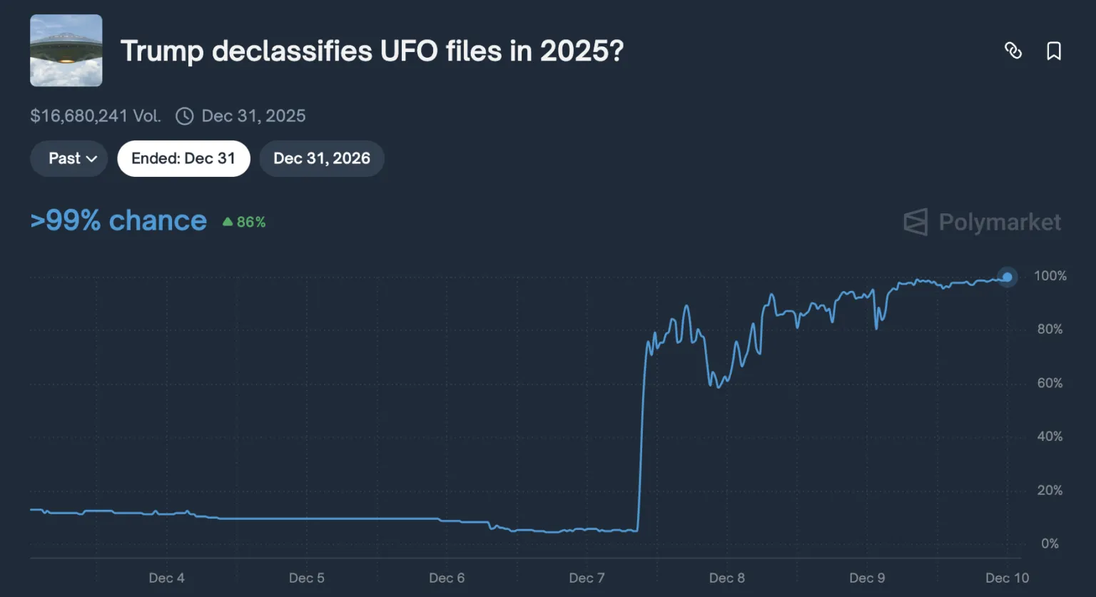 理论上的风险已经在2025年转化为血淋淋的现实。UFO文件解密市场的崩盘就是一个典型案例。这个市场于2025年4月创建,询问特朗普政府是否会在2025年解密UFO文件,交易量达到1600万美元,吸引了大量投机者。操纵过程分为几个精心设计的步骤:鲸鱼首先在结算前以接近面值的价格买入"YES"股份,然后利用Polymarket依赖的UMA预言机系统发起攻击。