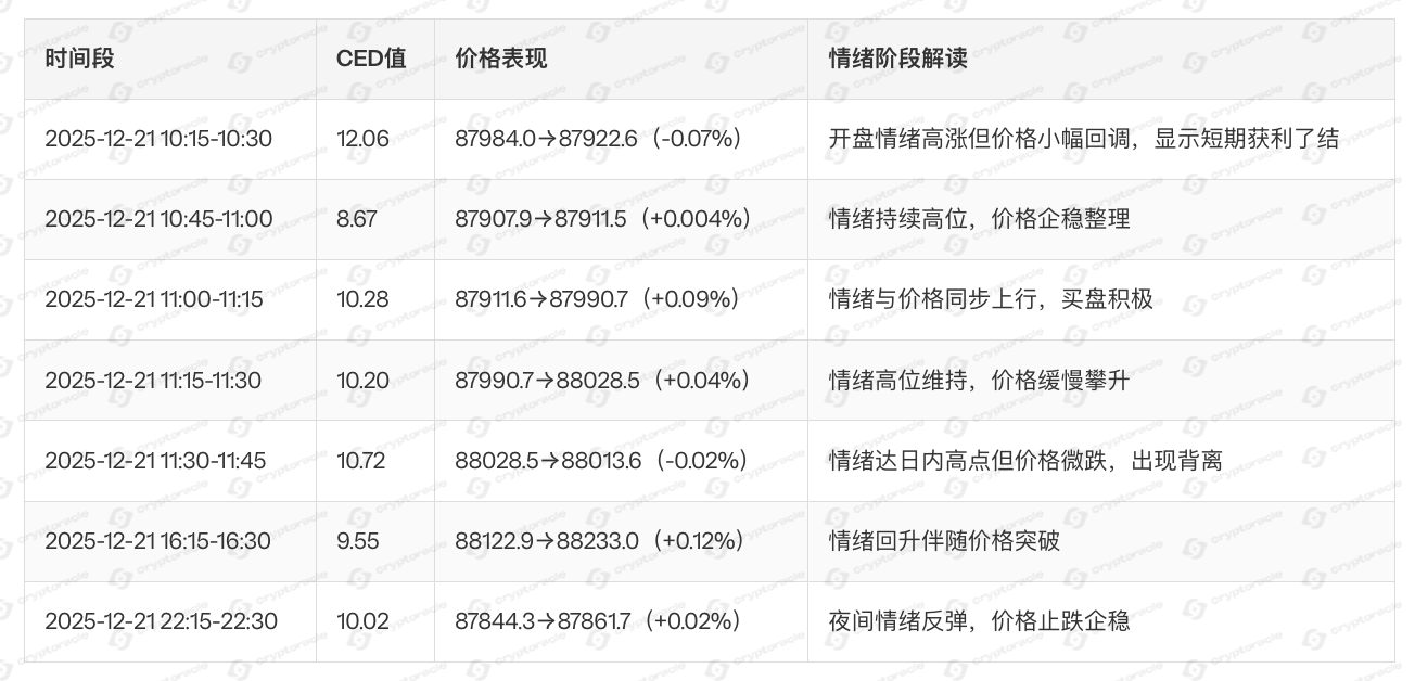 - 午后至傍晚(12:00-20:00):情绪逐步回落,CED维持在3-7区间,价格波动收窄