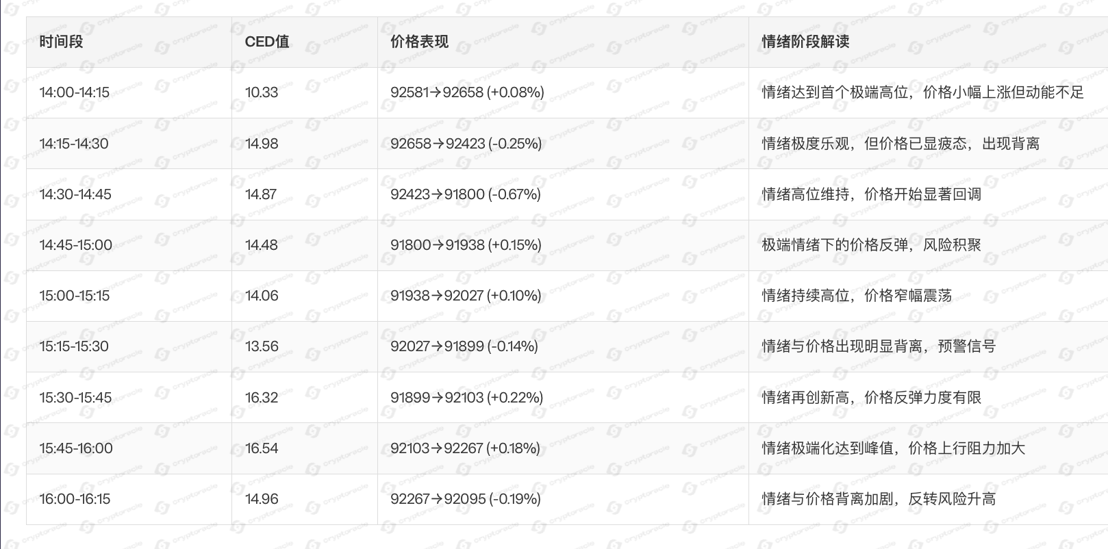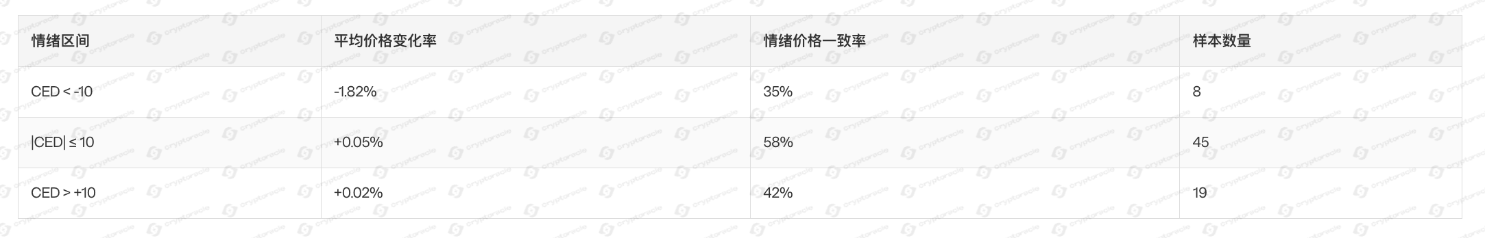 - 中性情绪区间价格表现相对稳定:|CED| ≤ 10时价格波动较小,情绪与价格相关性较高