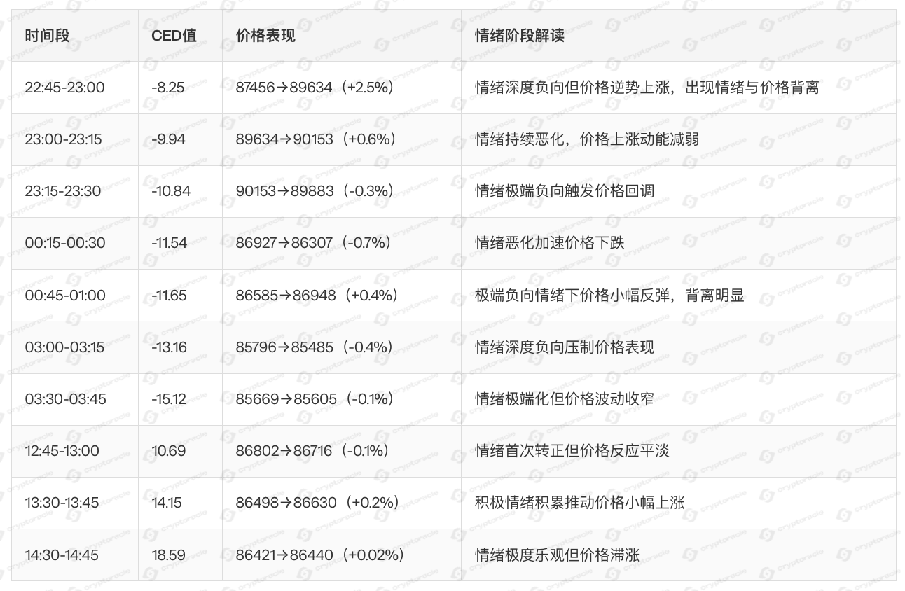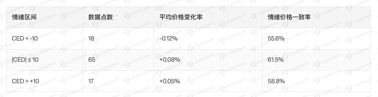 趋势结论:情绪极端化阶段(|CED|>10)价格波动率增大但方向一致性反而降低,显示极端情绪往往对应价格反转或震荡,而非趋势延续。中性情绪区间价格表现相对稳定。