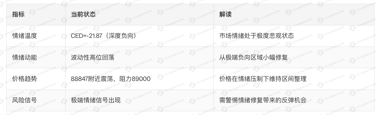 当前BTC市场情绪处于深度负向区域,但已从极端低点有所修复。价格在情绪压制下维持震荡格局,显示多空博弈激烈。极端情绪积累往往预示短期反转机会,建议关注情绪指标修复过程中的价格反应。市场整体缺乏明确方向,短期或以区间震荡为主。